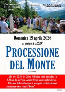 Domenica 19 aprile 2026 si svolgerà la 269° PROCESSIONE DEL MONTE Alle ore 10.30 in Chiesa Collegiata sarà presieduta la S. Messa dal reverendo don Giovanni Vergel, parroco di Riva Ligure. Al termine della celebrazione si proseguirà con la tradizionale